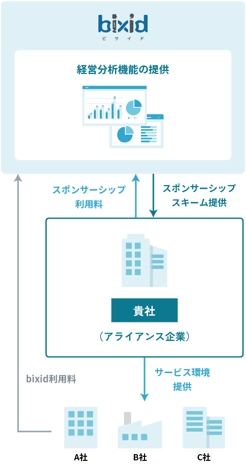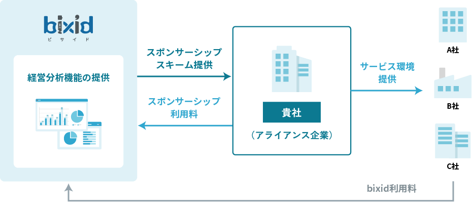 貴社ブランド(例:bixid sponsored by 〇〇)でbixid を提供いただくことで、レベニューシェア型のビジネスモデルをご展開いただけます。